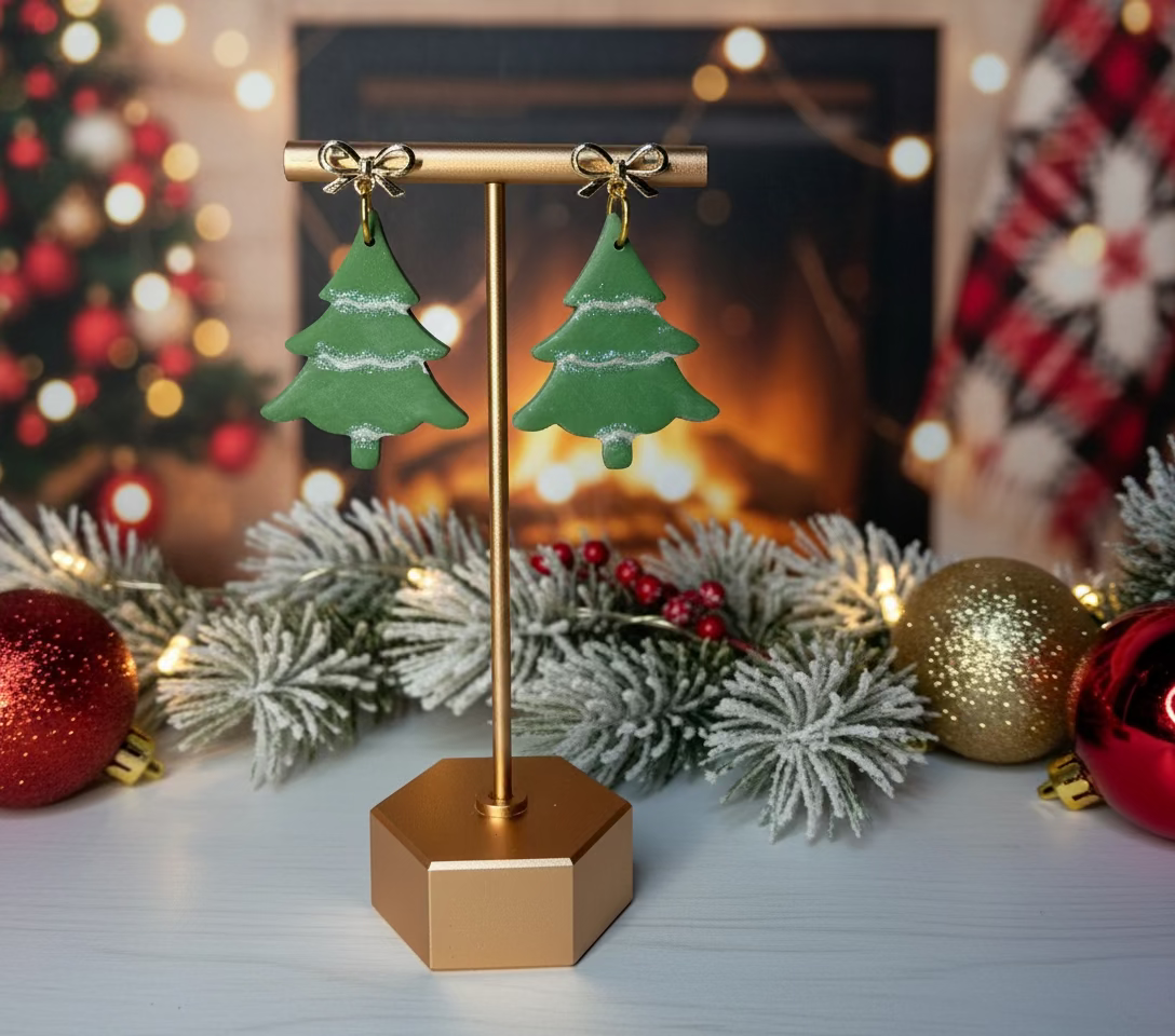 Dazzle this holiday season with our Elegant Christmas Tree Dangle earrings! Handmade with shimmery polymer clay and a gold bow post, these unique earrings are the perfect accessory for your festive outfits. Add a touch of whimsy to your look and spread the Christmas cheer with these charming statement earrings.