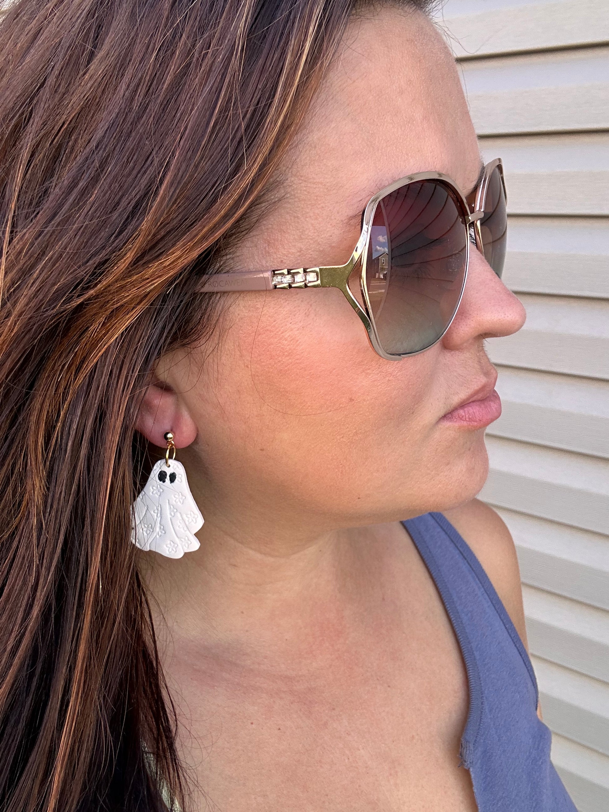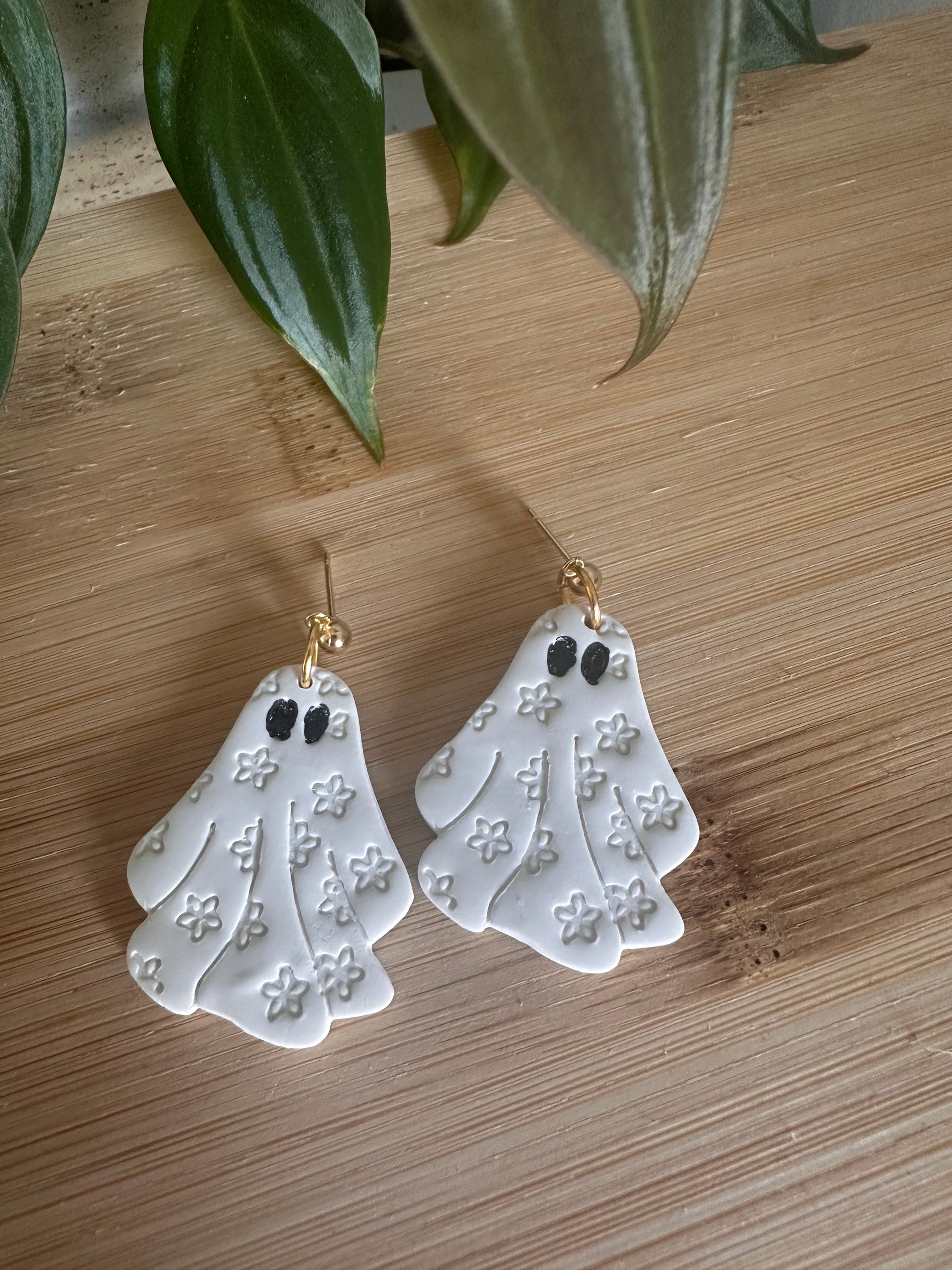 These earrings are the perfect mix of spooky and retro with their white ghost design and vintage floral pattern. Add some unique flair to any outfit with these statement accessories. Who says ghosts can't be fashionable?
