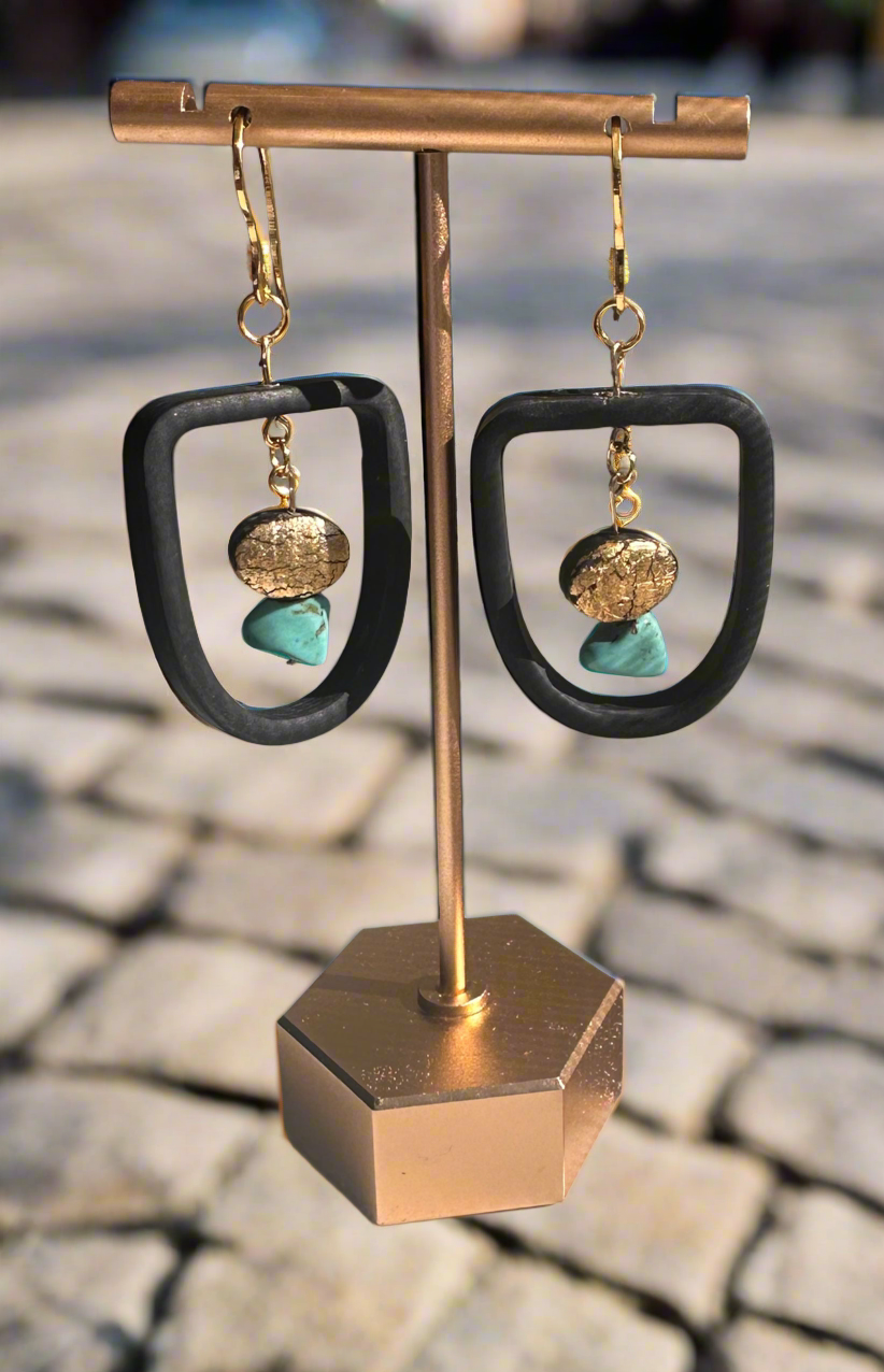 Get ready to make a statement with our Yaya Turquoise Dangles! These hand-crafted earrings are made with love using gold faux stone and real turquoise. Perfect for adding some playful movement to your look. (No two pairs are exactly alike!)